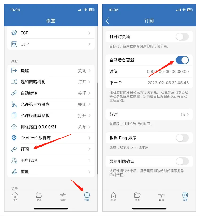 - 定时更新订阅: 订阅链接中的节点信息可能会发生变化。 为了确保您始终能够访问最新的节点,请定期更新订阅。 您可以在 Shadowrocket 的 “配置” 页面中找到您的如飞云订阅配置,然后手动点击 “更新” 按钮。 建议您至少每周更新一次。 也可以设置自动更新,在配置页面开启"自动后台更新”。